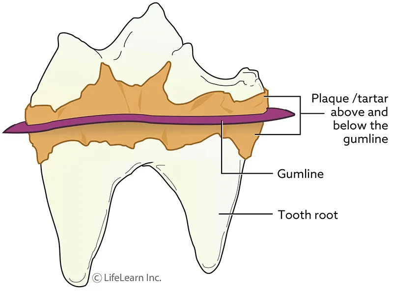 Periodontal disease starts with gingivitis (with early inflammation of the gums). Gingivitis results from plaque (bacterial slime) that accumulates on the tooth surfaces and contacts the gingiva. Plaque is a biofilm and home to many thousands of bacteria. Some of this plaque is naturally removed during eating or by the cat’s tongue. However, plaque quickly builds without daily brushing and eventually (over 36-48 hours) mineralizes, forming hard tartar (also called calculus). Tartar has a rough surface to which plaque can “stick” more readily. Untreated gingivitis may lead to further inflammation of the other tissues of the periodontium. Progression of the periodontal disease leads to loss of tooth support and loss of the tooth.